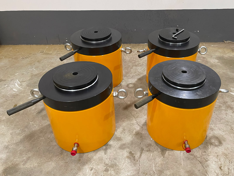 d)新的或久置的油壓千斤頂,因油缸內存有較多空氣,開始使用時,活塞桿可能出現微小的突跳現象,可將油壓千斤頂空載往復運動2-3次,以排除腔內的空氣。長期閑置的千斤頂,由于密封件長期不工作而造成密封件的硬化,從而影響油壓千斤頂的使用壽命,所以油壓千斤頂在不用時,每月要將油壓千斤頂空載往復運動2-3次。